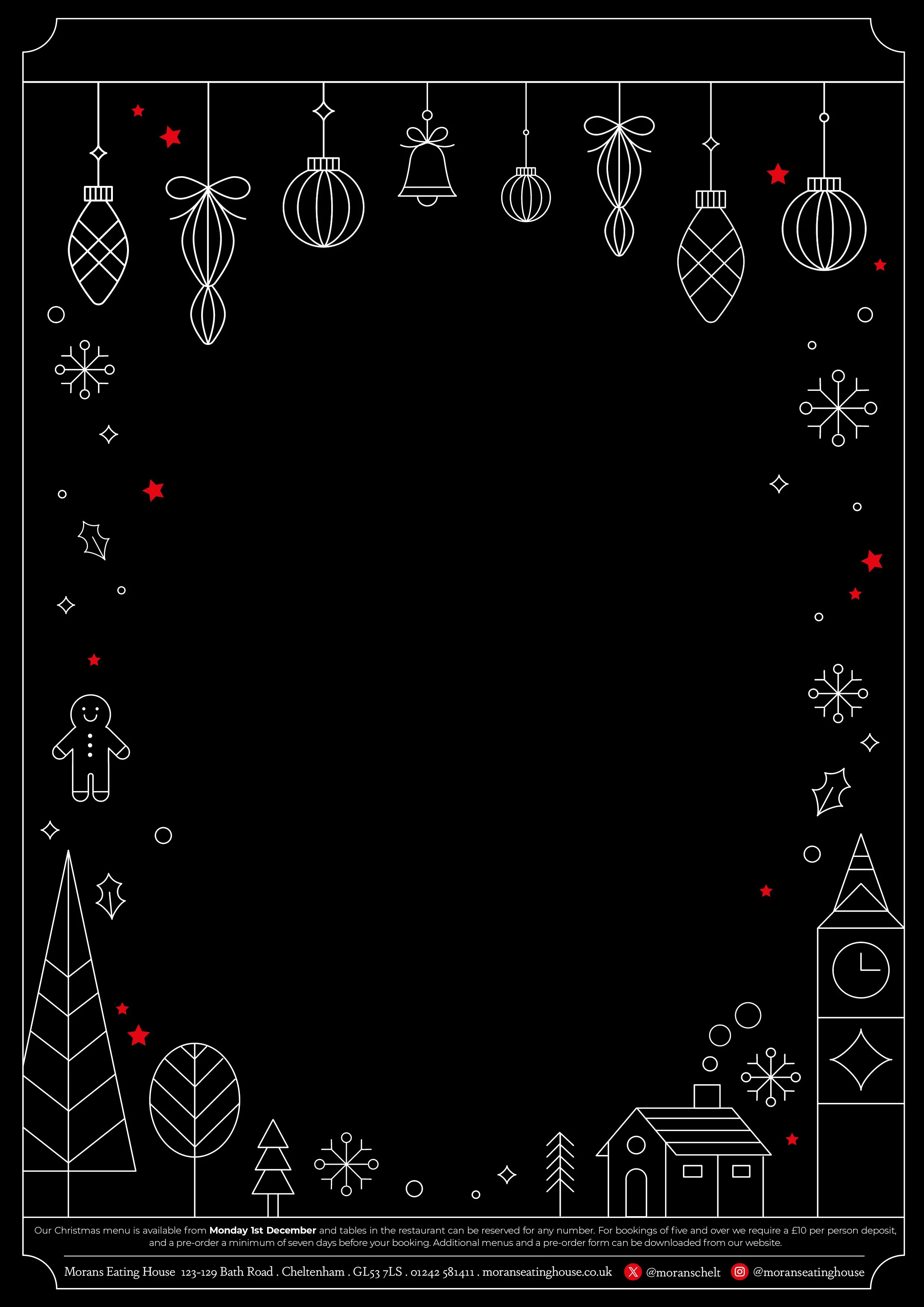 Our Christmas Menu will be available all day from Monday 1st December. Tables in the restaurant can be reserved for any number. For bookings of 5 and over we require a £10 per head deposit and a pre-order at least seven days before the date of your booking. Unfortunately we are unable to reserve tables in the wine bar. Our regular menu will also be available throughout December.